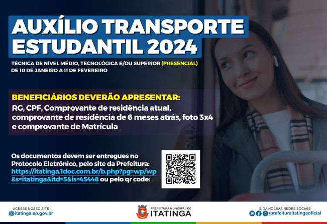 A Prefeitura de Itatinga está abrindo as inscrições para o Auxílio Transporte destinado a Educação Profissional Técnica de Nível Médio, Tecnológica e/ou Superior, mantidos por instituições oficiais, públicas ou privadas, que tenham por objetivo o deslocamento do Município de Itatinga/SP para as instituições de ensino localizadas em outros municípios. As inscrições estarão disponíveis de 10 de janeiro a 11 de fevereiro, exclusivamente pelo site da Prefeitura, através do protocolo 1doc.